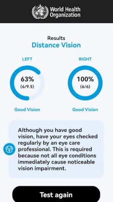 The principle of WHOeyes is based on how an eye care professional would test your vision using a conventional chart in a clinical setting. The accuracy of WHOeyes was tested in three research studies. The app is does not replace the need for regular eye checks by an eye care professional, even if your vision is good. WHO and the developers of the app cannot be held responsible or liable for any incorrect results.